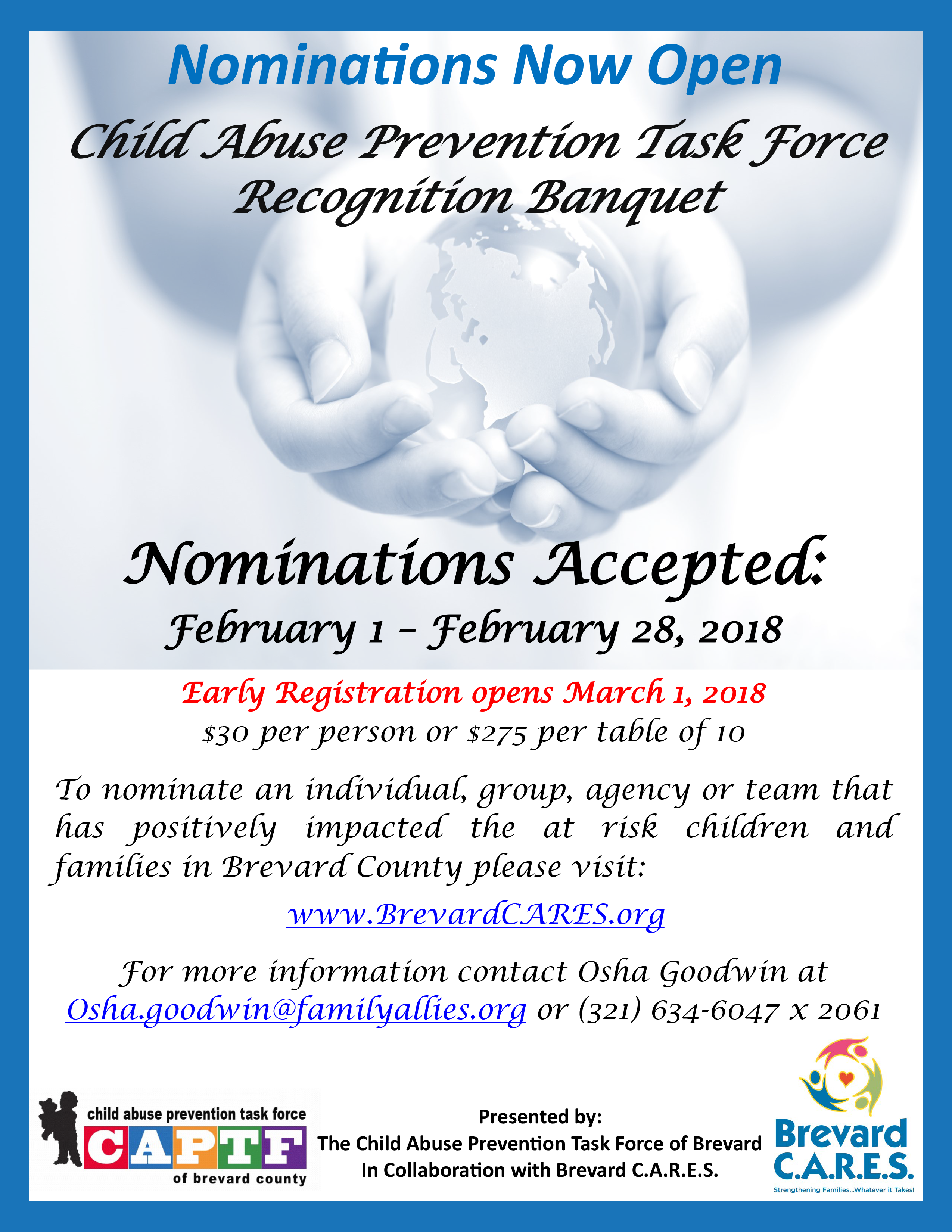 Nominations are now open for the 2018 Child Abuse Prevention Task Force Recognition Banquet. Nominations will be accepted February 1 – February 28, 2018. Nominate an individual, group, agency, or team that has positively impacted the “at risk” children and families in Brevard County online here.