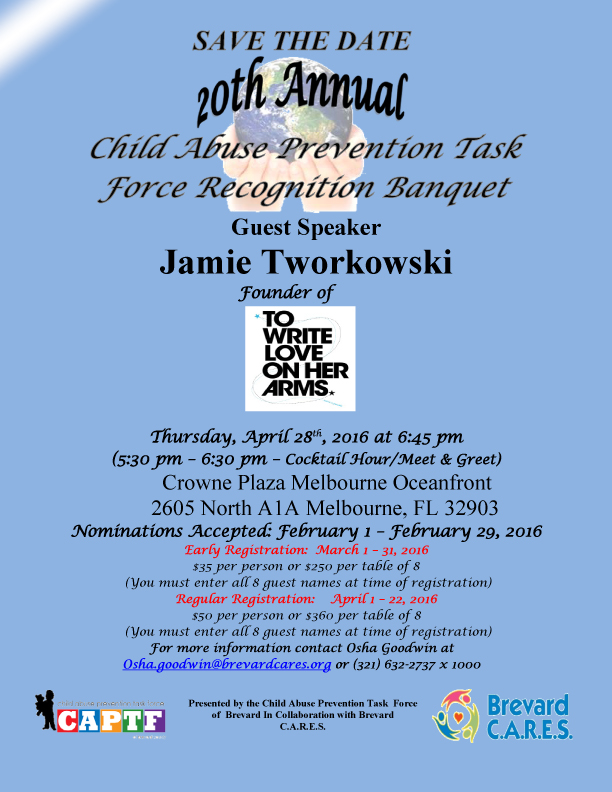 Registration is now open for the 20th Annual Child Abuse Prevention Task Force Recognition Banquet on Thursday, April 28, 2016 at the Crowne Plaza Melbourne Oceanfront at 5:30 p.m.